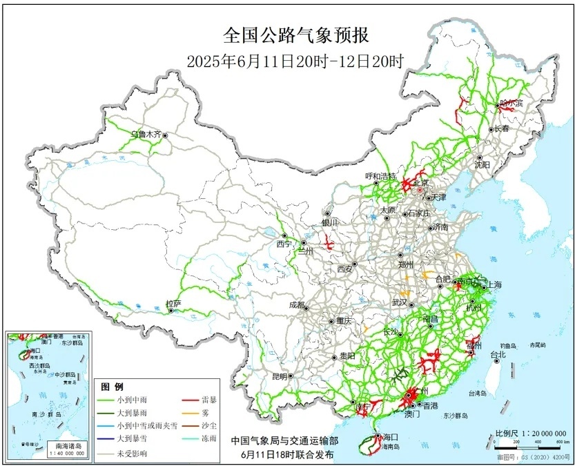 6月11日,交通运输部发布全国公路气象预报,预计6月11日20时至12日20时,广东北部和南部沿海等地部分地区有中到大雨,广东南部局地有雷暴。